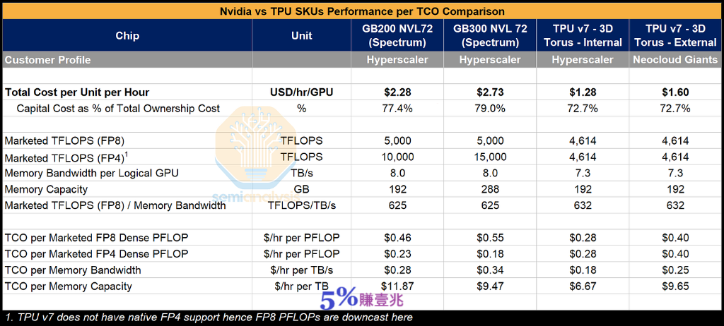 (圖表:TPU v7 (Ironwood) vs GB200/GB300 比較) 理論絕對性能是一回事,但真正重要的是每總擁有成本(TCO) 的真實世界性能。 雖然Google透過Broadcom 採購TPU 並支付高額利潤,但這遠低於Nvidia 不僅在銷售GPU 上,而且在包括CPU、交換器、NIC、系統記憶體、佈線和連接器在內的整個系統上賺取的利潤。從Google的角度來看,這導致全3D 環面(3D Torus)配置的每Ironwood 晶片的全包TCO比GB200 伺服器的TCO 低約44%。 這足以彌補峰值FLOPs 和峰值記憶體頻寬約10% 的短缺。這是從Google的角度以及他們採購TPU 伺服器的價格來看的。 (表格:Nvidia vs TPU SKU 每TCO 效能比較) 那麼當谷歌加上他們的利潤後,對外部客戶來說呢?我們假設在Google向外部客戶租賃TPU 7 賺取利潤的情況下,每小時TCO 仍然可以比GB200 的成本低約30%,比GB300 的成本低約41%。我們認為這反映了Anthropic 透過GCP 的定價。