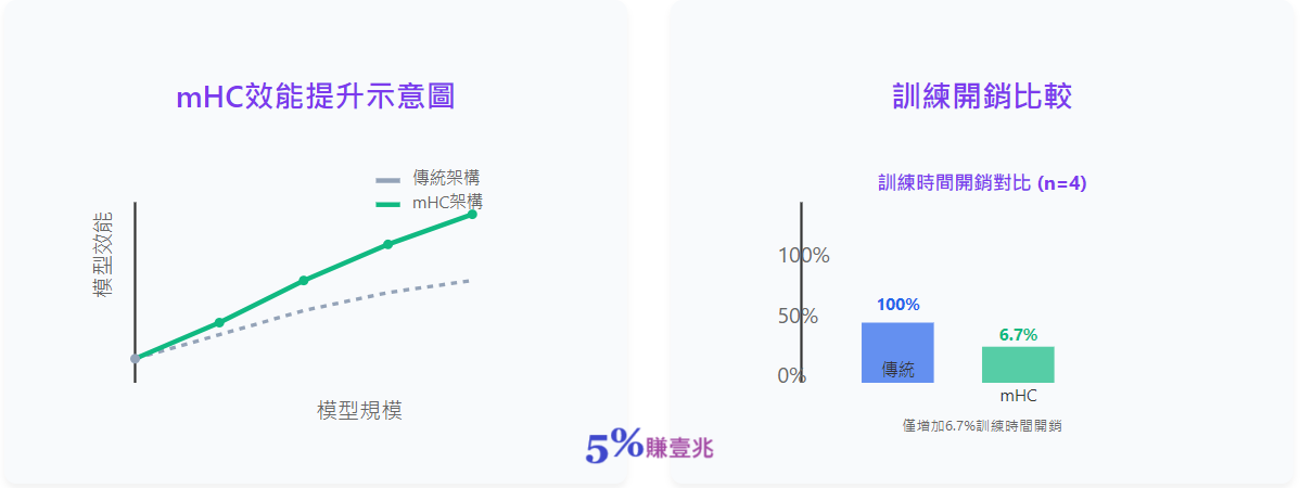 DeepSeek mHC架構技術解析流形約束超連接如何革新AI基礎設施與記憶體產業 mHC架構概述mHC(流形約束超連接)是DeepSeek為大規模AI模型設計的創新架構,在n=4擴展倍率下,僅增加6.7%訓練時間開銷,卻能帶來顯著的效能提升。 核心優勢: mHC不僅解決了穩定性問題,且在大規模訓練中(如27B模型)表現出卓越的可擴展性,為基礎模型的拓樸架構演進指明了方向。 mHC效能提升示意圖訓練開銷比較對記憶體產業的影響mHC架構對記憶體產業帶來了多方面的深遠影響,從產品設計到產業生態都將發生變革。 主要影響面向